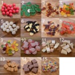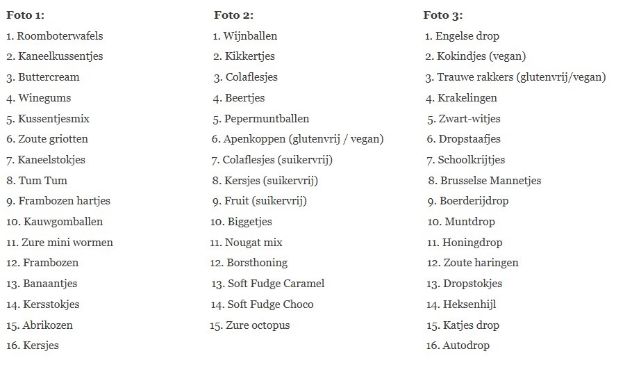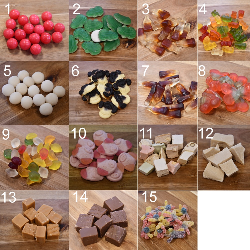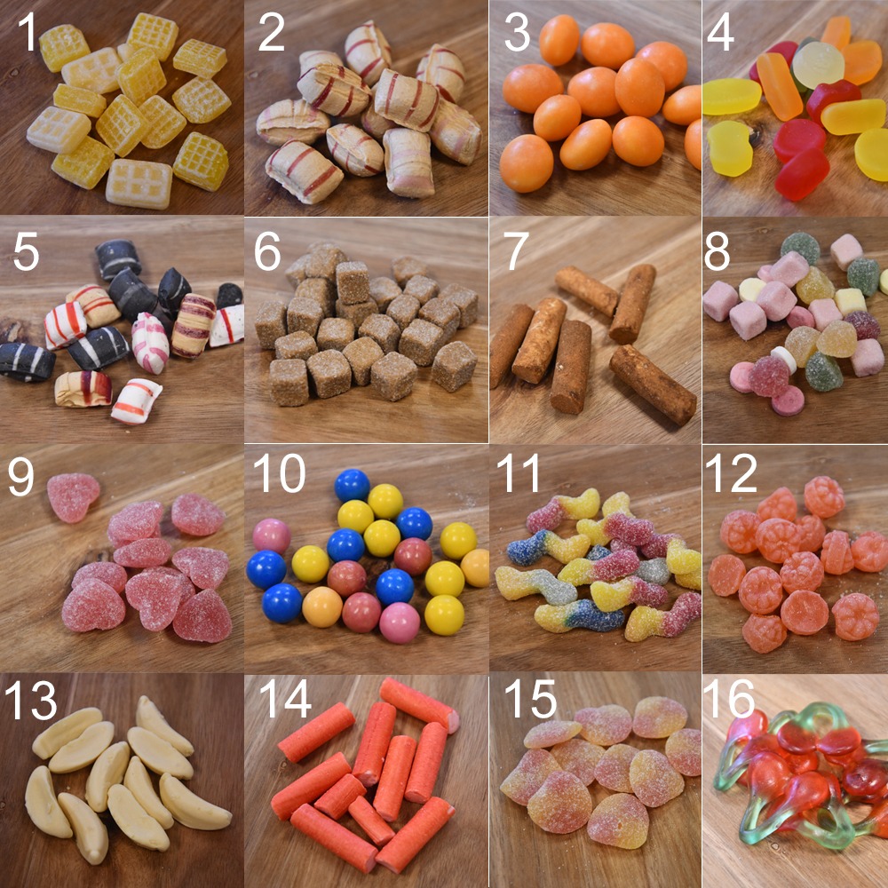 • Uit de 3 foto’s met snoepsoorten mag je in totaal 6 smaken kiezen.
